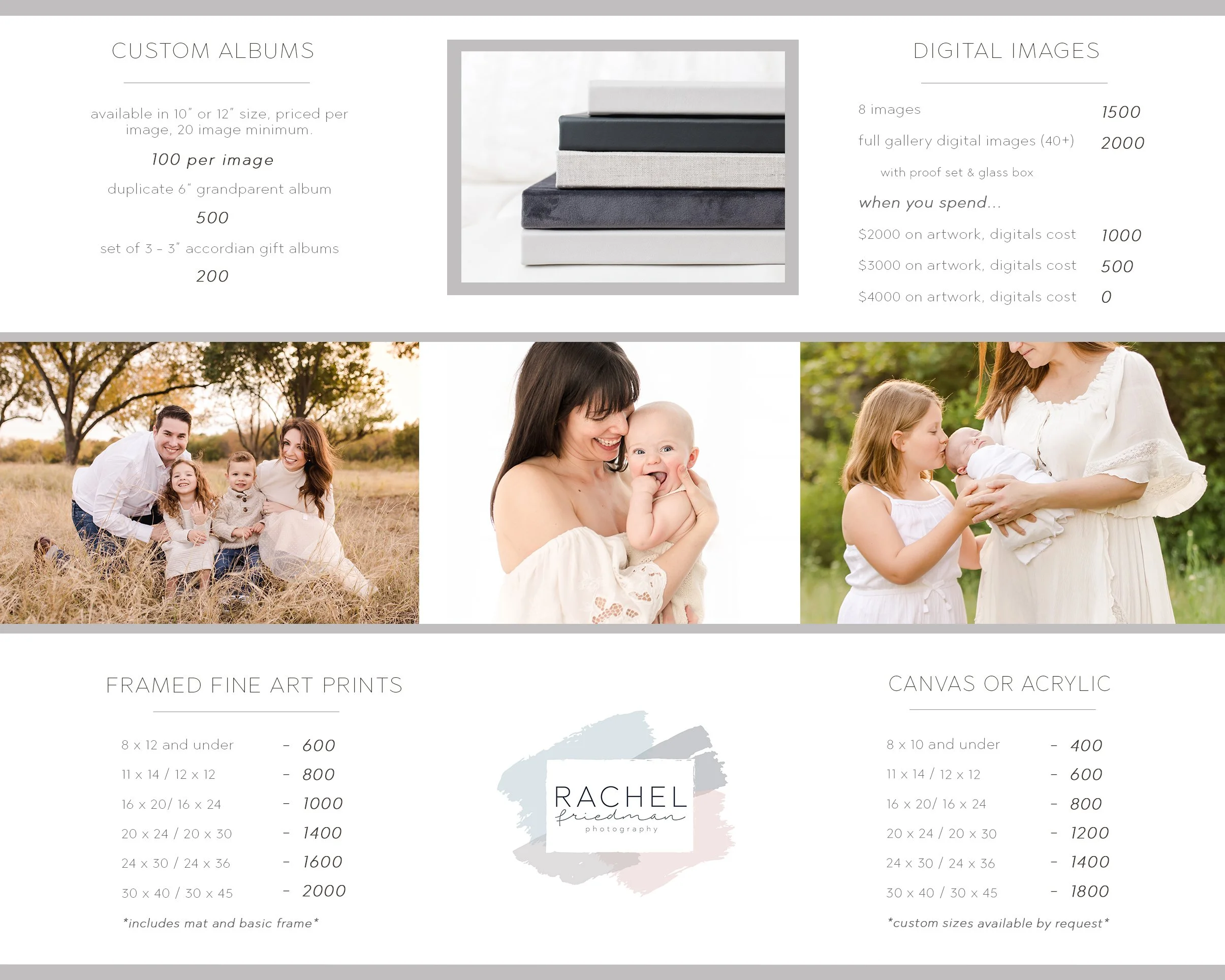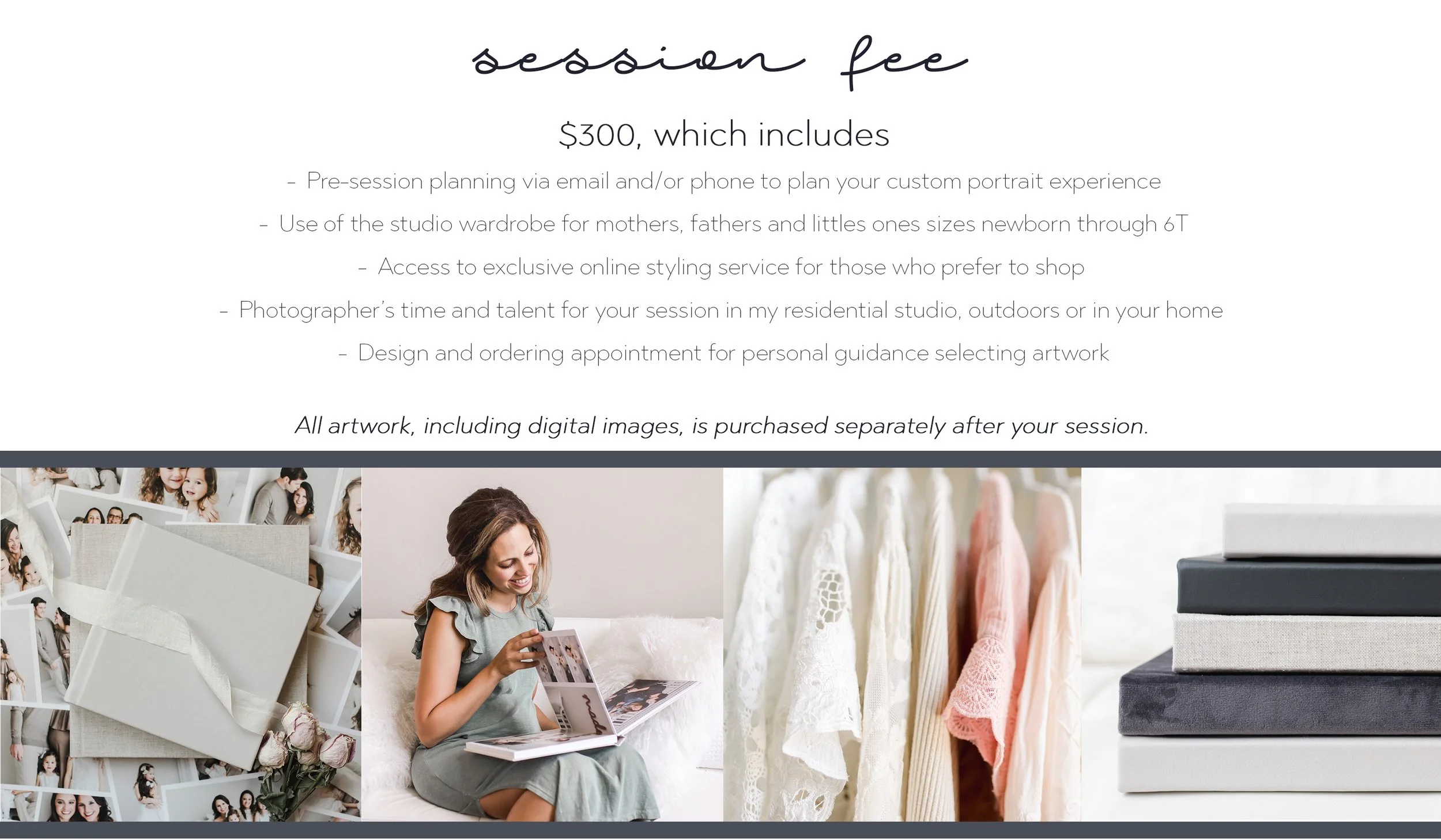 After the session, we connect via Zoom, and my clients are welcome to order “just the digitals” or have me help you with creating your gallery wall or heirloom photo album that you can enjoy for generations to come. There is no minimum purchase requirement, and you don’t make your selections until after our session together at your reveal and ordering appointment. Here are the investment details for your session: